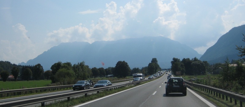 Even voor Salzburg stop ik om de tank weer even vol te gooien, om een vignet te kopen en om even te eten. Terwijl ik zit te eten zie ik dat er aan de andere kant ook al weer een file staat. Ik denk dat nu zo’n beetje over het hele stuk van Salzburg – Munchen file staat of dat er langzaam rijdend verkeer is:
