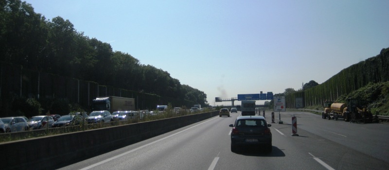 Rond 9.00 uur vertrek ik uit Meppel, tank nog even in Staphorst en steek iets meer dan een uurtje later de Ned – Duitse grens over. Tot nu gaat het prima, maar op de radio hoor ik al dat er bij Oberhausen files staan. Bij de voorbereiding zag ik al dat het vandaag een drukke dag zou worden op de Duitse wegen, maar dat zou met name gaan om terugkerend vakantieverkeer wat noordwaarts gaat. En dus kan ik redelijk door rijden, maar aan de andere kant staat het helemaal vast: