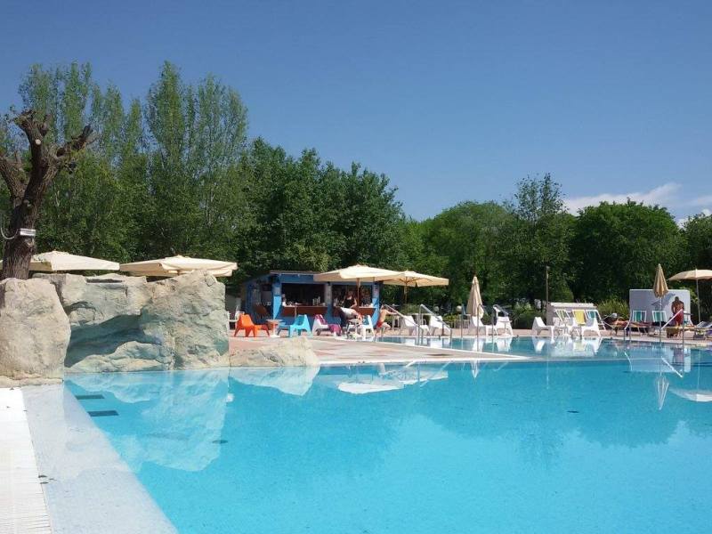 Zoals je ziet: veel bomen. Best lekker nu met dat warme weer, maar ook lastig om de schotel tussen de bomen door te krijgen. Camping Sabbiadoro beschikt over veel voorzieningen waaronder een mooi zwembad en het ligt op ca. 250 meter van een prachtig strand: