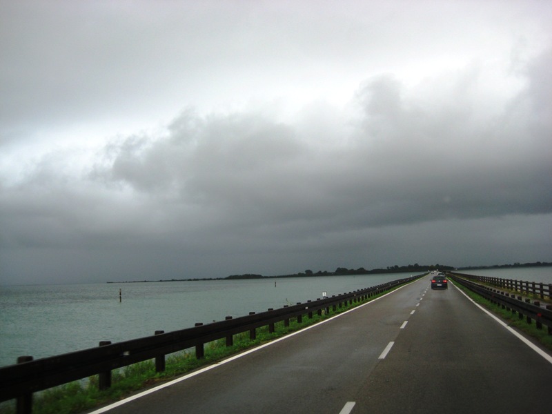 Het regent nog steeds onophoudelijk en rijd ik elk jaar bij een strakblauwe lucht over de dijk van Grado naar Aquileia, dit keer ziet het er iets somberder uit: