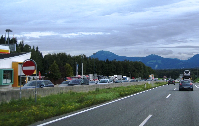 Dat heeft natuurlijk weer te maken met de grenscontroles. Ik dacht dat we daar inmiddels al vanaf waren. Maar helaas … Even later heb ik ook Salzburg achter me gelaten. Het gaat nog steeds lekker! Even voor Villach stop ik even om te lunchen. Het weer is inmiddels wat omgeslagen. Normaal gesproken verwacht je – naarmate je zuidelijker gaat – dat het weer steeds beter wordt, maar het is juist andersom.