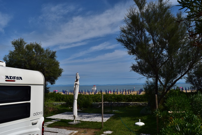 En inderdaad … Massimiliano is niet aanwezig. De receptioniste is echter super behulpzaam en belt hem even. Of we morgenvroeg even om tafel kunnen ? Tuurlijk ! Overnachten is geen probleem en dus ga ik op zoek naar een plekje. Ondanks dat ze hier op 10 augustus een tornado gehad hebben (flinke schade bij een aantal campings hier in de omgeving, bij een camping iets verderop werden 30 mobilhomes verpletterd door de bomen en bij Union Lido alleen al werden al 620 !! bomen omver geblazen. Gek genoeg zonder noemenswaardige ongelukken), staan er nog flink wat bomen hier op de camping. En dus kies ik voor exact dezelfde plek als vorig jaar: