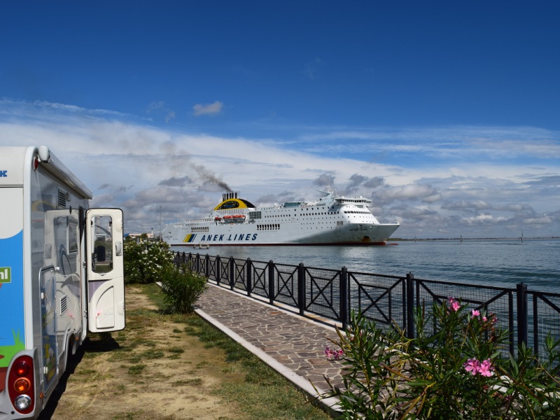 Tijdens het bierdrinken  klets ik even bij met Paolo. Ik vertel hem dat het me opvalt dat het zo druk is. Dat zag ik ook al op Camping Miramare in Punta Sabbioni en gezien de vele cruiseschepen welke voor me in de haven liggen, kan het niet anders dan heel erg druk zijn in Venetie. Paolo vertelt me dat er vandaag iets van 200 campers, caravans en tenten staan. En dat er daarnaast ook nog flink wat mobilhomes verhuurd zijn.