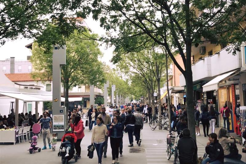 En vlakbij het gezellige centrum van Lignano Sabbiadoro. Vooral ’s avonds. In de zomer en ook nu nog, zijn de winkels tot 23.00 uur geopend. Dat moet ook wel, want overdag ligt iedereen aan het strand en is het centrum uitgestorven. Onderstaande foto is buiten de zomerperiode genomen en dan is het ook overdag gezellig druk: