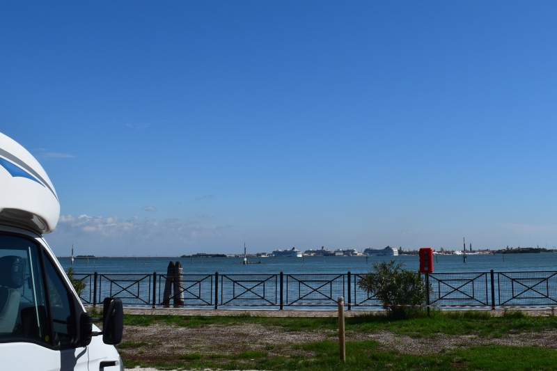 Vlakbij de camping kom ik in een enorme file. Geen idee wat er gebeurd is, maar het staat nagenoeg helemaal stil. Een Italiaan probeert zich “op zn Italiaans” links langs een vrachtwagen te wurmen en dan zie ik dat het na de rotonde ook nog 4-baans is. Ik moet iets verder linksaf en dus wurm ik mij ook langs de vrachtwagen, pak “geheel op zn Italiaans” nog een stuk verdrijvingsvlak mee en sla even verder linksaf. Via het industrieterrein bereik ik even later Camping Fusina. De enige camping rond Venetie waar je Venetie vanaf de camping kunt zien liggen. Kijk: