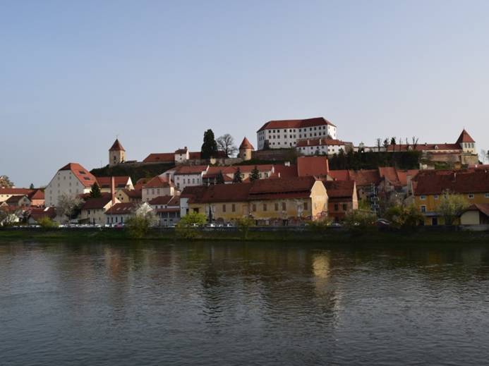 En dus wandelen we al om 8.00 uur langs de rivier de Drava met een mooi uitzicht op het stadje Ptuj. Ptuj is overigens het oudste stadje van Slovenië en vanaf de waterkant hebben we een mooi zicht op het oude kasteel wat hoog boven het stadje uitsteekt: