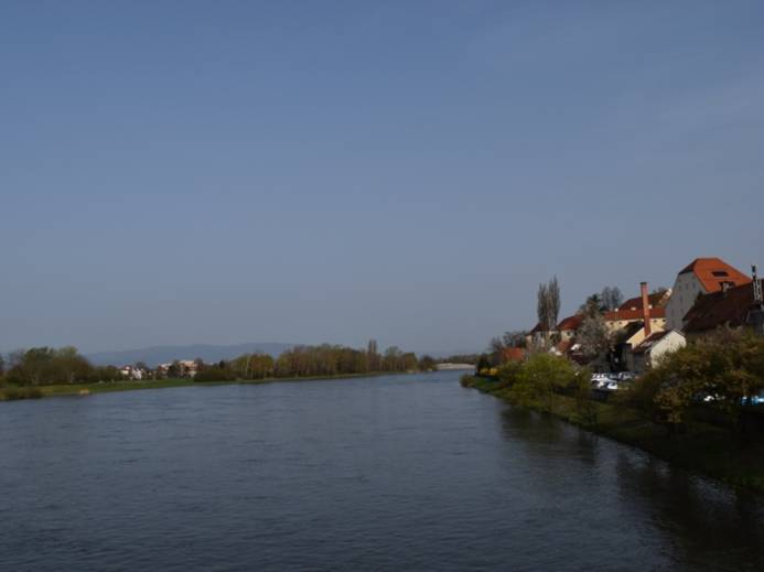 op het enorme complex van SAVA Terme Ptuj om ons aan te melden. Op de foto hierboven zie je op de achtergrond het oude centrum van het mooie stadje Ptuj wat we morgenvroeg even gaan bezoeken. Het complex van SAVA Terme Ptuj en het stadje Ptuj wordt doorsneden door de rivier de Drava. Op de foto hieronder zie je er nog net een stukje van.