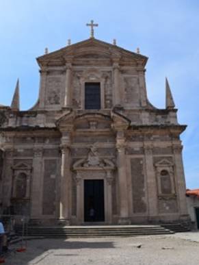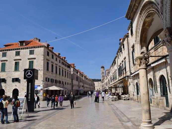 We pakken de bus van 10.45 uur en om 11.00 uur (afstand = 6km.) krijgen we de enorme muren van het oude centrum van Dubrovnik in het vizier. We lopen eerst (Main Street) Placa in, op zoek naar een Pharmacia. Want we hebben allebei flink last van hooikoorts en zijn bijna door de medicijnen heen. De Pharmacia bestaat trouwens al ruim 700 ! jaar … Aan het einde van de Placa maken we deze 2 foto’s ….