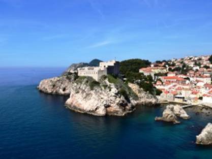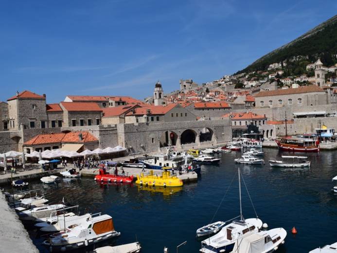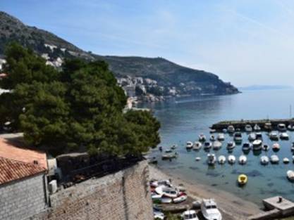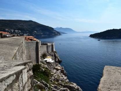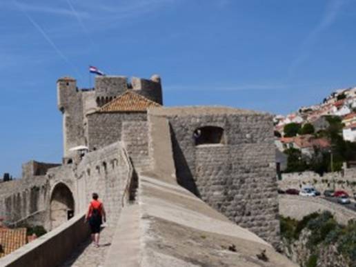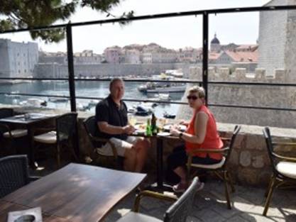 Terwijl we over de muur wandelen zien we ook de kabelbaan welke je naar Fort Imperial leidt. Vanaf Fort Imperial heb je een geweldig uitzicht over de stad, maar we twijfelen of we nu wel zo’n goed zicht hebben. Kosten zijn 120 kuna = € 16 voor een retourtje. “Tijdens de twijfel” zien we ineens een heel leuk terrasje en besluiten daar even te gaan lunchen. Eenmaal beneden is het even zoeken hoe we bij het restaurant (Bistro Revelin Club) kunnen komen, maar even later zitten we – genietend van een prachtig uitzicht – aan een heerlijke lunch: