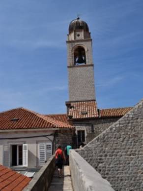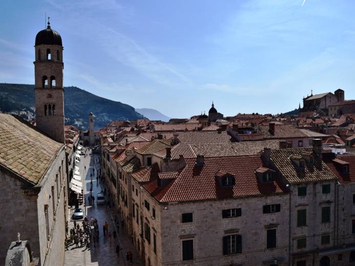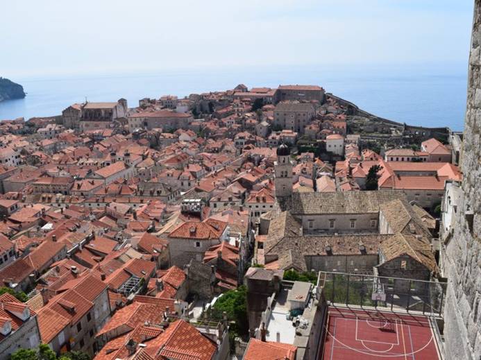 en gaan vervolgens richting de City-wall. Die is overigens niet gratis te betreden – toegang kost 120 kuna = € 16 –  maar geloof me, dat is echt de moeite waard ! Ben je niet goed ter been, dan kun je er beter niet aan beginnen want de wandeling over de muur duurt 2 uur en het is bijna continue trappetje op, trappetje af … Eenmaal boven is dit het uitzicht over de Placa: