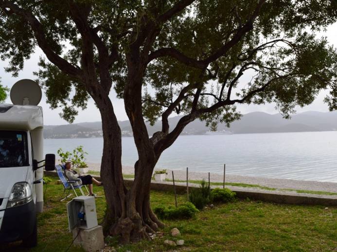 En dus gaan we verder naar Camping Palme (de Kroaten gebruiken vaak het woord Kamp i.p.v. Camping, maar ik vind Camping wat plezieriger klinken …). De eigenaar is niet aanwezig, maar we hebben voor morgen al een afspraak gemaakt en hier overnachten is prima. En de plek … tja, kijk zelf maar: