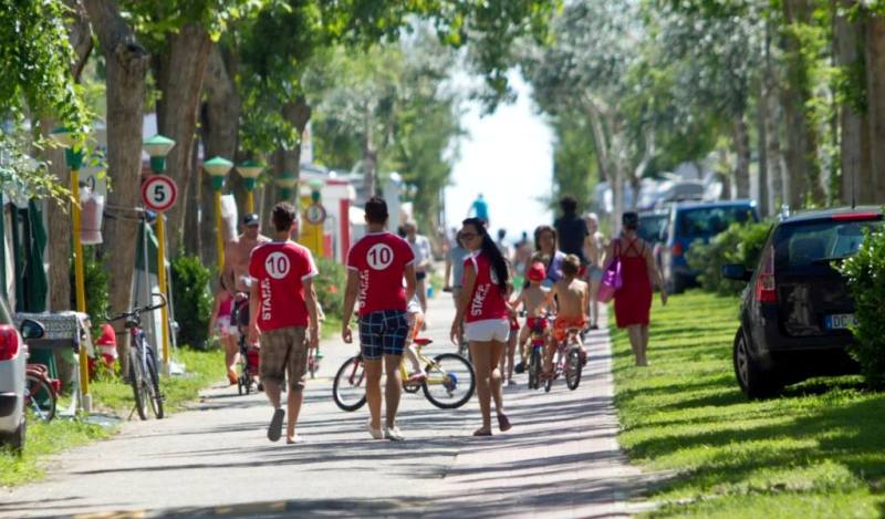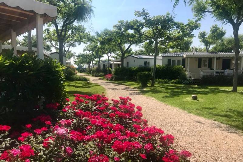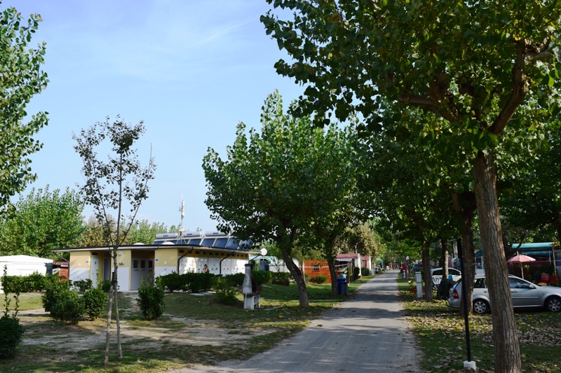 En dus meld ik me even later bij de receptie van Camping Internazionale. Eigenaar Massimo verwelkomt me hartelijk, we nemen de papieren door, het bestaande contract wordt verlengd en we gaan weer verder. Volgende camping is Camping Village Miramare. Ook hier word ik vriendelijk verwelkomd en omdat ik hier nog nooit overnacht heb, komen eigenaar Alessandro en moi overeen om hier het weekend te blijven. Het zakelijke gesprek doen we vanmiddag, eerst even op zoek naar een plekje. Je komt dan eerst door dit mooie laantje: