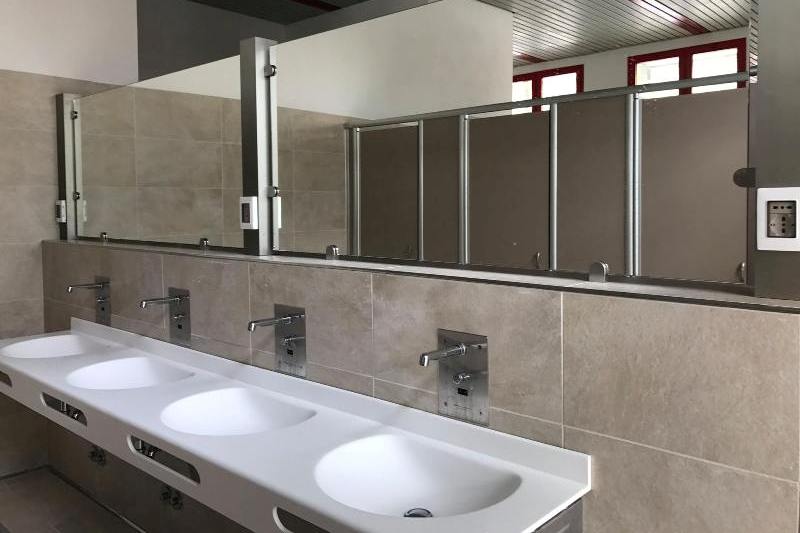 Later op de dag komen er nog een flink aantal (voornamelijk Italiaanse) campers bij en is het een gezellige boel We staan vlakbij het sanitairgebouw en ook dat ziet er prima uit (vernieuwd 2017!):