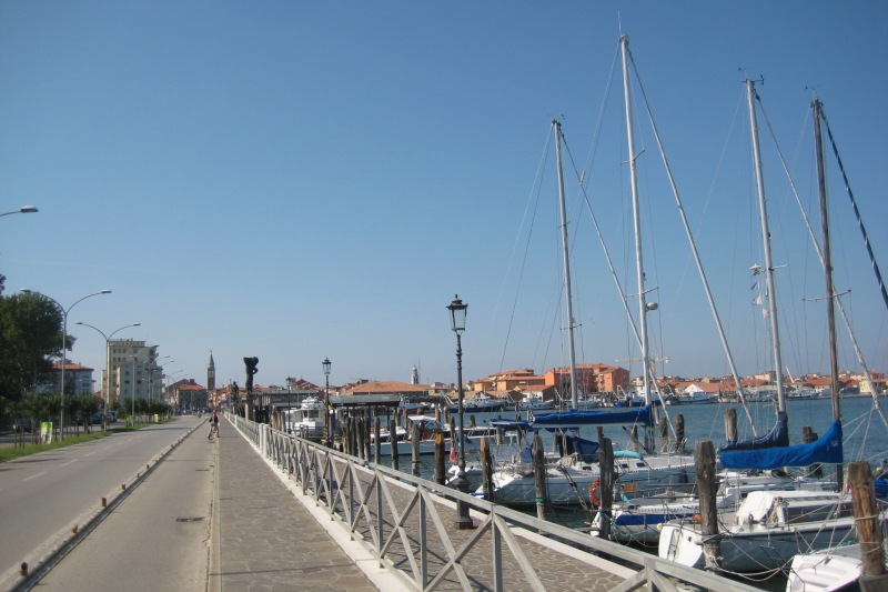 En even later fietsen we langs het strand van Sottomarina di Chioggia richting het oude centrum van Chioggia. Beide plaatsen worden gescheiden door deze dijk/brug: