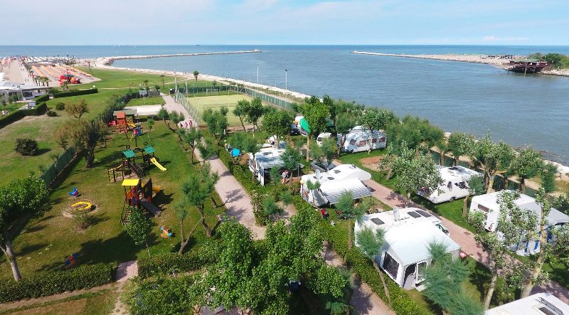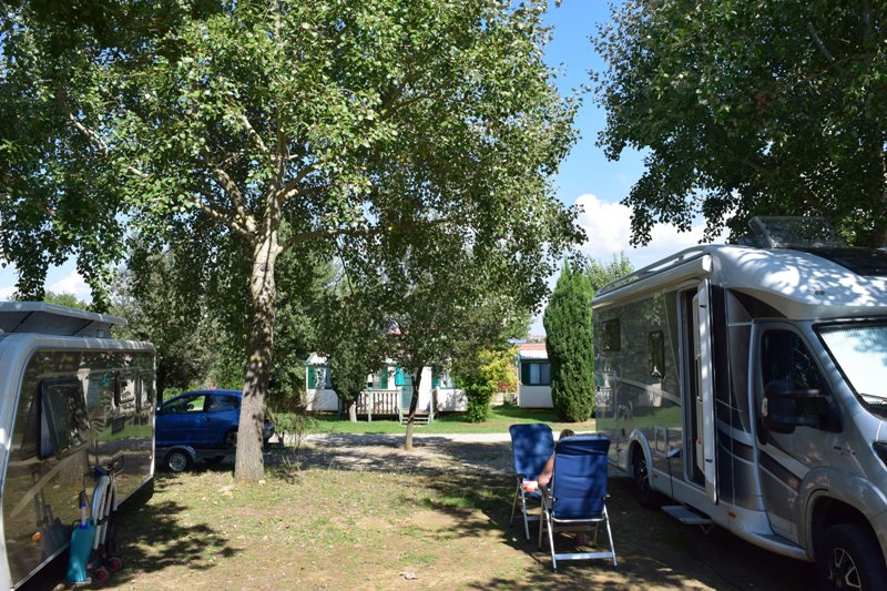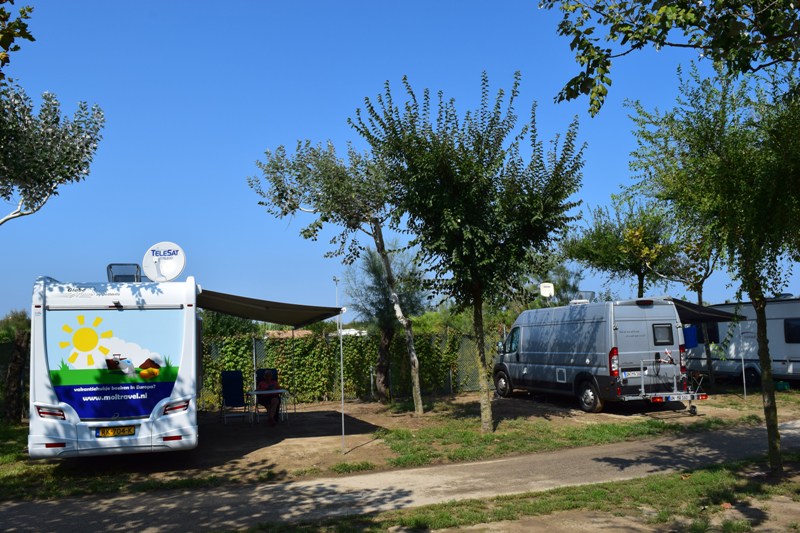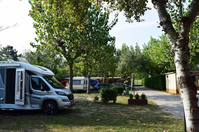 We groeten eigenaar Alessandro van Camping Village Miramare en rijden richting Camping Oasi. Bij de receptie tref ik eigenaresse Valeria. In principe had ik hier vanmiddag om 14.30 uur afgesproken, maar nu we hier overnachten vinden we het beide handiger om morgenvroeg 9.15 uur in gesprek te gaan. En dus rijden we – in overleg – de camping op en vinden even later een mooi plekje. Helaas maar een klein beetje in de schaduw en dus doen we de screens aan de zonkant gauw dicht. Meestal sta ik hier op dezelfde plek (vandaar geen nieuwe foto …):