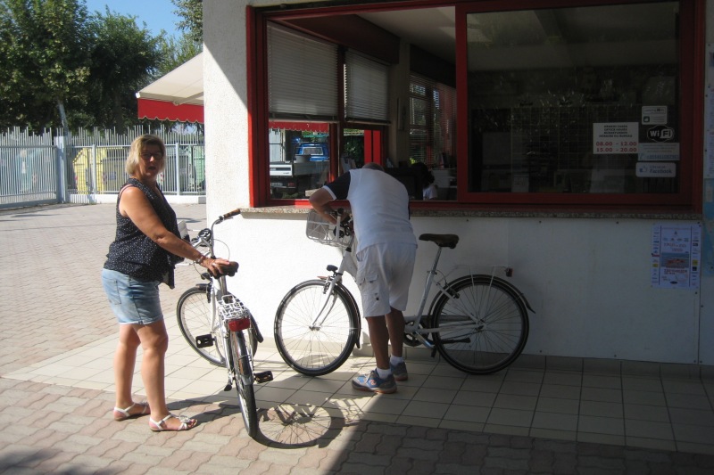 Vanmiddag gaan we op het fietsie naar Chioggia, maar eerst moet mn werk af … En dus ben ik de rest van de ochtend achter de laptop aan het werk. Tussen de middag (laat … 13.00 uur) gaan we even lunchen en daarna lopen we richting de receptie. De fietsen worden “van stal” gehaald: