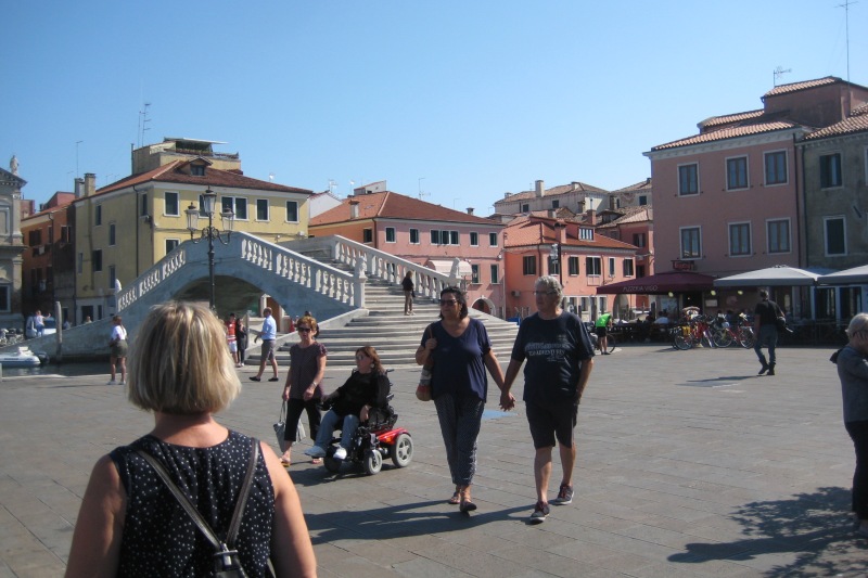 De winkels zijn nog niet open (op zondag 16.00 uur), maar we zijn nog niet weg Aan het eind van de hoofdstraat is het een drukte van jewelste. Want de boot naar Venetie vertrekt. Ook vanaf Chioggia kun je met de boot naar Venetie (is wel wat langer varen …). Ook zijn er in de haven boot-excursie-tochten te maken. We vinden het wel prima en lopen via deze iets kleiner uitgevallen Rialto brug: