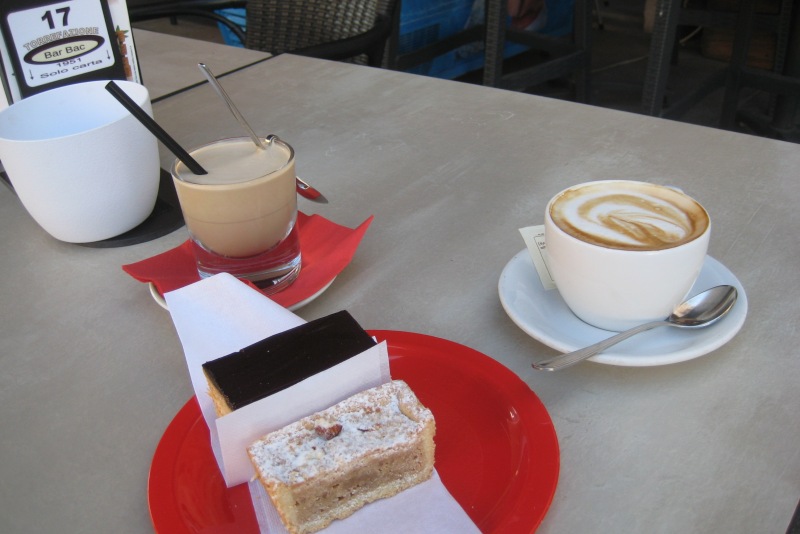Hier is nog autoverkeer toegestaan. Verderop niet …. en dus is het de hoogste tijd voor een bakkie koffie, uiteraard met wat lekkers erbij. Hennie kiest voor een cappuccino, ik kies voor een ijskoffie …. heerlijk: