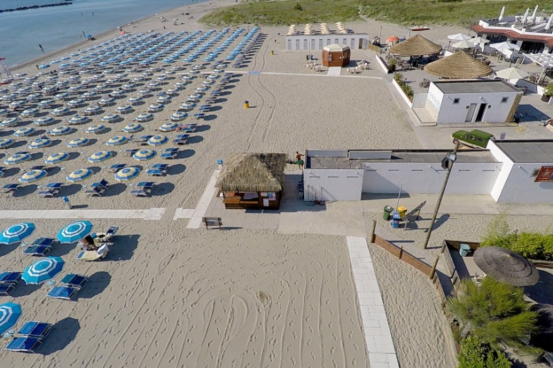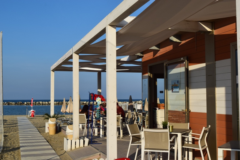 Als we de camper geïnstalleerd hebben, gaan we eerst even – buiten in de schaduw van de camper – lunchen en daarna kruip ik nog een tijdje achter de laptop. Om 16.00 uur is het in de camper niet meer uit te houden, tijd om onder de luifel te gaan zitten. Aan het eind van de middag maken we nog even een wandeling naar en over het strand. En zien in de verte weer Camping Village Miramare liggen. Toch wel apart dat we nu iets verderop staan.