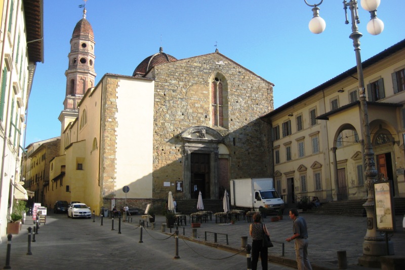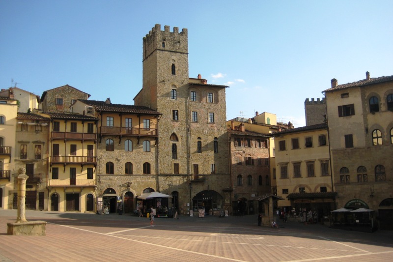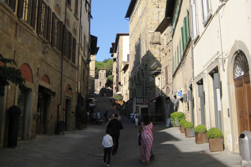 We kopen 2 kaartjes in de bus, kosten € 2,50 p.p. Tip: koop je kaartje in een bar of T(abac)-winkeltje, dan zijn ze goedkoper (€ 1,50). Met een poep en een scheet zijn we in het centrum van Arezzo, kopen daar dus eerst in een T-winkeltje 2 kaartjes voor de terugweg, maken een foto van de bus-tijden voor de terugweg en lopen de stad in: