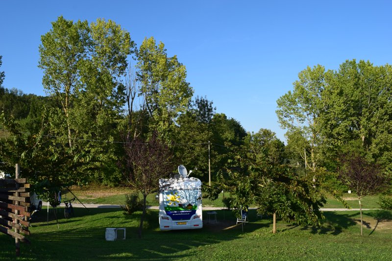 Ook nu hebben we weer een plekje in de schaduw uitgekozen en dus kan ik de rest van de middag achter de laptop aan het werk. Want ik moet nodig met de voorbereiding van de komende te bezoeken campings aan de slag. Daar ben ik de rest van de middag in ieder geval wel zoet mee. In de namiddag meldt Hans (de eigenaar) zich en spreken we af om aan het eind van de middag het zakelijke gesprek te doen en later vanavond even samen een borrel te gaan drinken. Dit is trouwens onze plek hier: