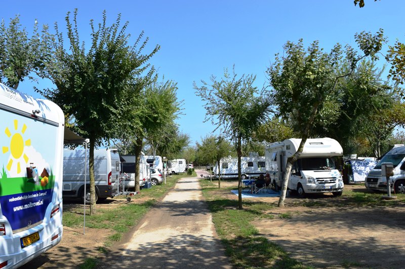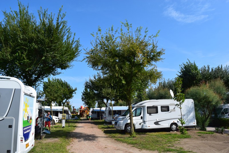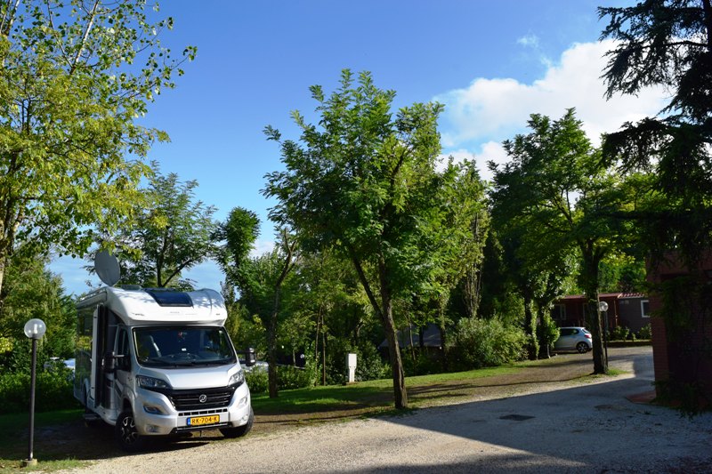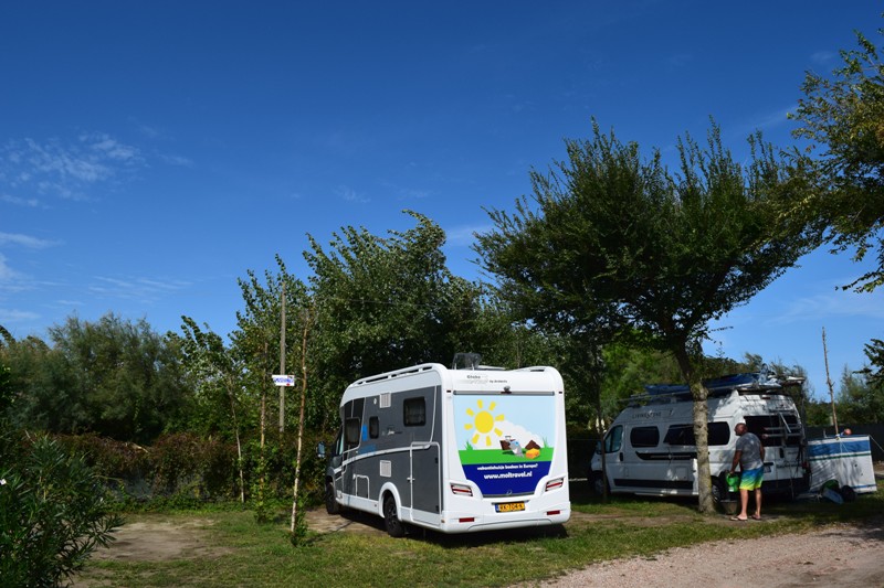 Tevreden rijd ik naar de vlakbij gelegen Camping Rubicone. Bij de receptie word ik opgevangen door mn contactpersoon Filippo. We spreken af dat we vanmiddag om tafel gaan en dus ga ik lopend op zoek naar een plekje. Mn keuze valt op een (zeer) grote plek, waar ik volgens mij de schotel wel tussen de bomen door krijg. En als dat niet lukt, kan ik nog wel een rondje op de plek maken. Zooo groot. Als ik de camper te plek heb maak ik gelijk even een paar foto’s: