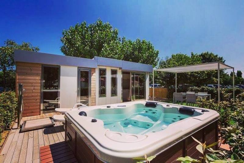 Hier op Camping Rubicone hebben ze mooie mobilhomes en verschrikkelijk mooie mobilhomes. Compleet met buitendouche, ligstoelen, strandje, palmboom en jacuzzi. Tis echt niet te geloven. Wat een luxe.