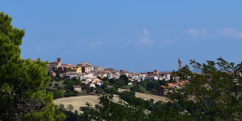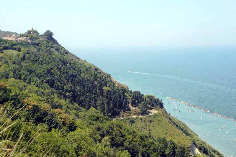 Even voor 11.00 uur rijd ik Camping Panorama op. Deze camping ligt aan de Strada Panoramica bij het plaatsje Fiorenzuola di Focara en op het zwaar slingerende weggetje is het even goed oppassen. Want volgens mij is er een fietstocht en de wielrenners komen soms plat op het stuur door de bocht zeilen. Van het uitzicht genieten is er dus niet bij. Dit zie ik alleen in een glimp: