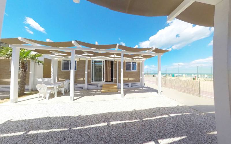 De camping ligt aan een prachtig mooi zandstrand, gescheiden door een fiets- en wandelboulevard. En zo op de vroege morgen is het behoorlijk druk. Als ik weer bij de receptie arriveer is ook mn contactpersoon gearriveerd en geholpen door een Engels sprekende receptioniste ontstaat er een leuk gesprek. Een klein uurtje later sta ik weer buiten met een aantal leuke contracten ! En gaan we onder andere promotie maken voor deze prachtige mobilhomes: