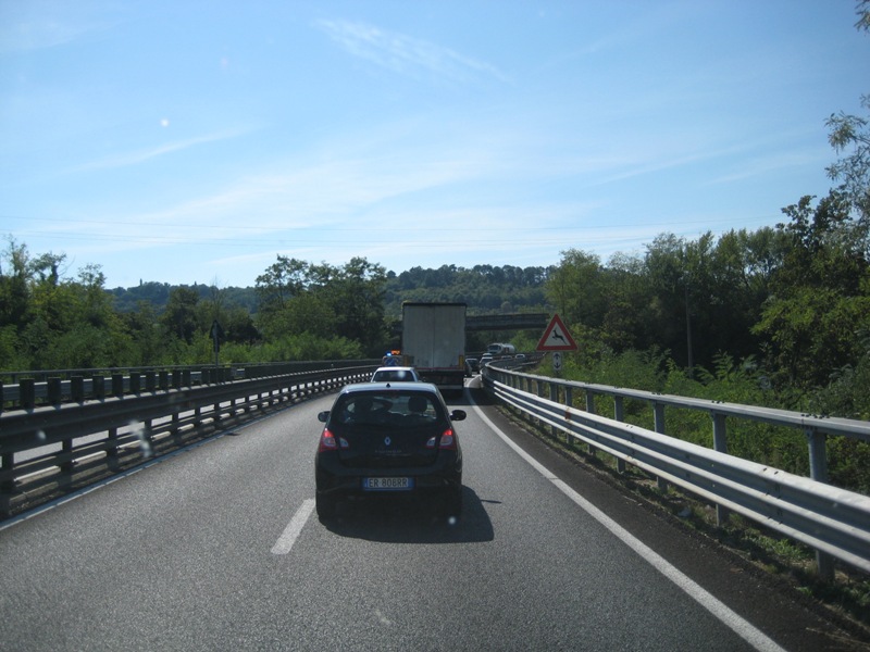 Ik heb een leuk (staand, dat weer wel …) gesprek, maar ik moet even geduld hebben voor “de uitslag”. En dus draai ik even later weer de autoweg op van Florence naar Siena. En net als ik denk “het schiet lekker op”, staat het ineens in een flauwe bocht stil. Er staat een auto stil op de linkerbaan (pech, ongeluk ?) en er wordt flink geremd: