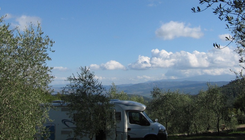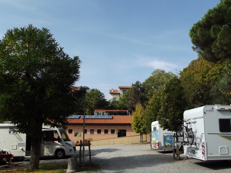 Maar goed, even verder pak ik bij Siena de afslag en even later rijd ik Camping Colleverde Siena op. Met de eigenaren kan ik het goed vinden en ik word vriendelijk ontvangen. Ook hier komt het beter uit als we later in gesprek gaan en dus ga ik eerst op zoek naar een plekje. Op deze mooie camping loopt het gaandeweg de middag behoorlijk vol, maar het is nu nog maar 12.30 uur en dus heb ik zo een plek gevonden: