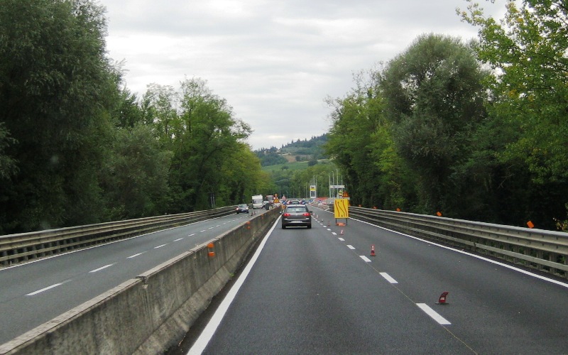 Even na 10.30 uur besluit ik me maar eens voor te bereiden op de rit van vandaag en schrik eerlijk gezegd van de tijd. Shit … is het al zo laat ?! En dus maak ik de camper direct klaar voor vertrek, groet Alessandro (zoon van de eigenaar) nog even in het restaurant en draai even later de E35 (tolweg) op richting Florence. Na een paar kilometer neem ik de afslag richting Siena, tik € 0,50 tol af (kan ik betalen met creditcard ?) en rijd even later over de 4-baans autoweg richting Siena. Het wegdek is behoorlijk opgeknapt, maar helaas hebben ze de weg vergeten breder te maken…. Nog steeds heb je links en rechts direct een vangrail langs de weg, maar gelukkig zijn er nagenoeg geen vrachtwagens op de weg.