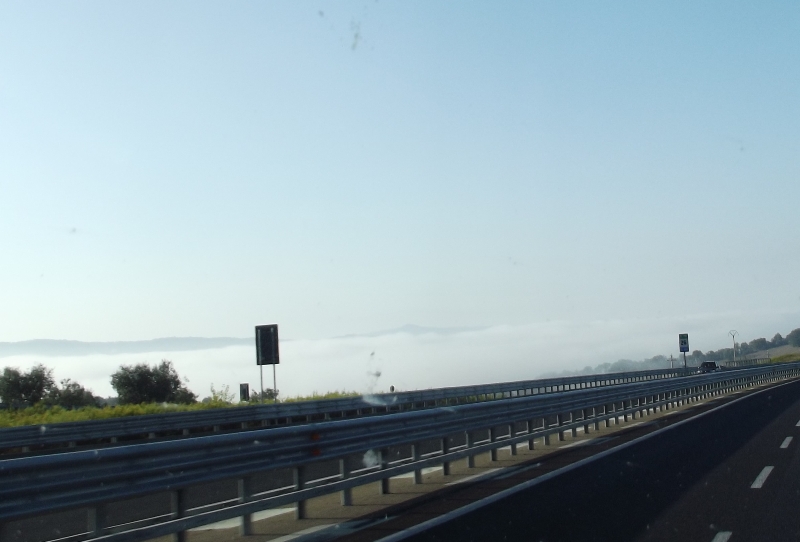 Verderop richting Grosseto is de 4-baans weg klaar en zie ik dat de toppen van de bergen boven de bewolking uit komt. Heel apart: