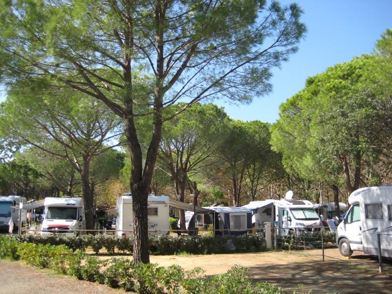 Ik hoef m gelukkig niet in te halen, neem de afslag en rijd even later Marina di Bibbona binnen. Hier heb ik geen navigatie meer nodig, want hier ken ik allemaal campings wel uit het hoofd te liggen. En dus meld ik me even later bij de receptie van Camping Village Le Esperidi. Ik word vrijwel direct opgevangen door een “poortwachter”, meld even bij de receptie wie ik ben en kruip daarna met de “poortwachter” in een golfkarretje op zoek naar een mooi plekje. Ach mooi hoeft eigenlijk niet. Ik wil graag in de schaduw, met tv- en wifi-ontvangst en graag 6 ampère stroom.