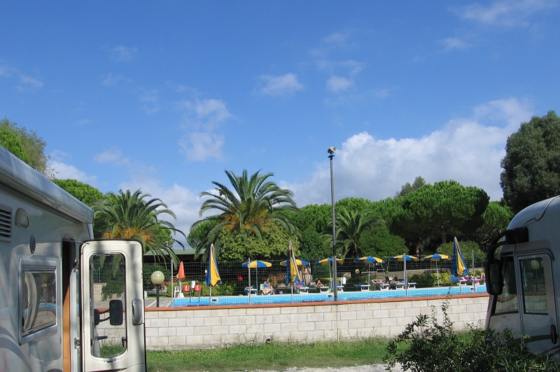 Het gesprek is prima en even later is alles geregeld en ga ik richting mn eindbestemming van vandaag: Camping Village Pappasole vlakbij Piombino. Geen eind rijden vandaag, want vanmiddag moet ik voor morgen en dit weekend nog afspraken zien te regelen. Eigenlijk kan ik nu eerst niet verder (dan Pappasole). En dus meld ik me even na 12.00 uur bij de receptie. Mn contactpersoon is in gesprek, maar ik krijg een telefoontje wanneer (en of) we in gesprek kunnen en dus rijd ik de camper naar de camperplaats op de camping.
