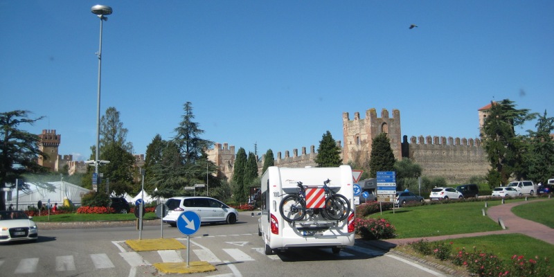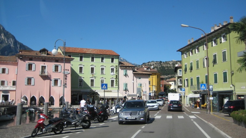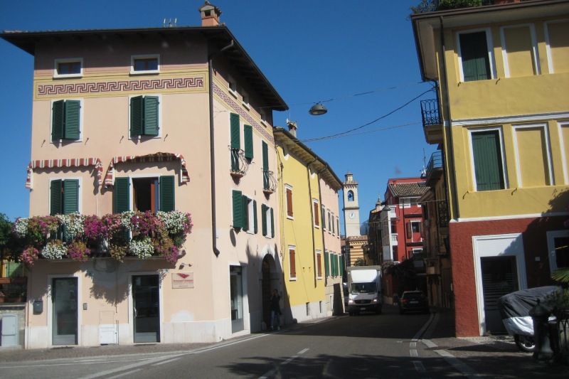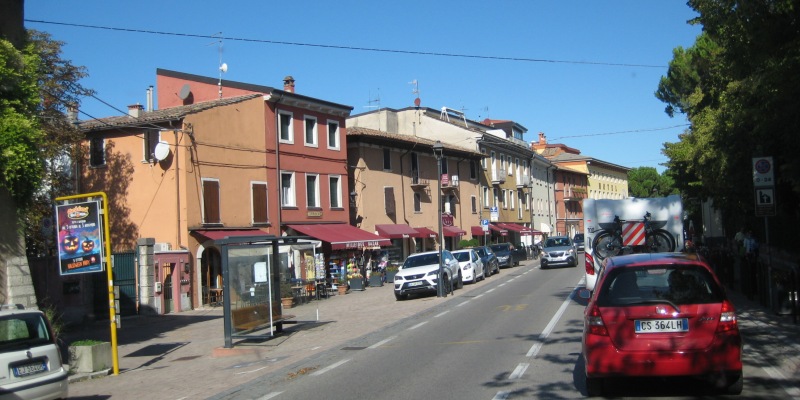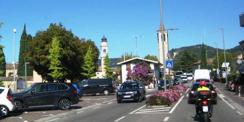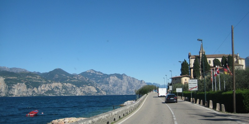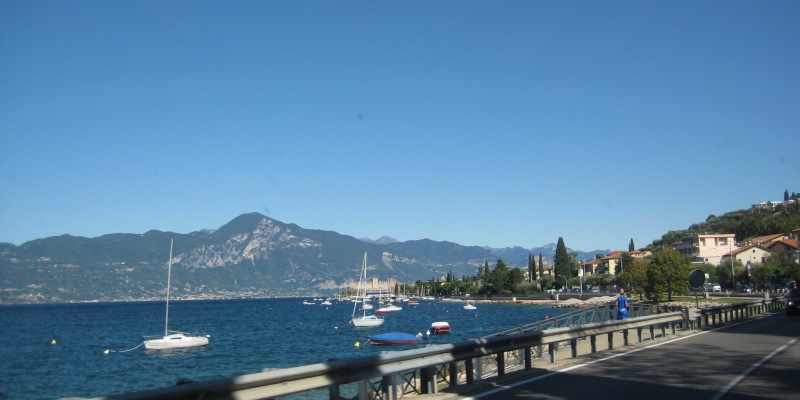 En vervolgens ga ik op pad. Dit keer niet via de snelweg want de laatste jaren kom ik steeds bij Brescia in de file te staan. En dus pak ik bij Fidenza een binnenweg en rijd ik via Roccabianca en Asola richting Desenzano del Garda (aan het Gardameer). Ook daar pak ik niet de snelweg, maar de parallel aan de snelweg lopende autoweg richting Peschiera del Garda. Om niet teveel tijd te verliezen volg ik die autoweg richting Lazise en rijd even later Lazise binnen: