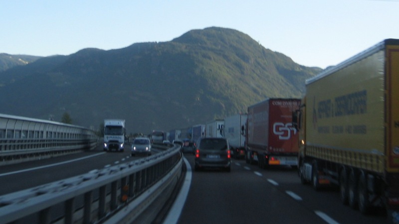 Bij Bolzano is het inderdaad druk …. heel druk. Ik hoor iets over een wegafsluiting verderop, maar begrijp niet goed waar het precies is. En dus rijd ik maar gewoon door. Ondertussen passeer ik een rij vrachtwagens … nou eerlijk gezegd heb ik nog nooit zoveel vrachtwagens volledig stil zien staan: