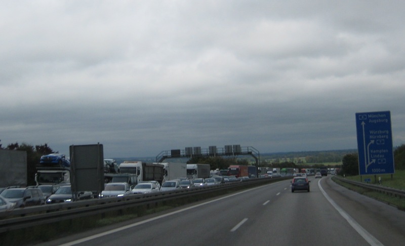 Eenmaal weer op de “7” hoor ik op de radio dat er diverse plaatsen vertraging is. O.a. op de “8” van München – Ulm. Even denk ik dat ik daar niet langs kom, maar als ik even later bij Ulm de “8” richting Stuttgart genomen heb, kom ik in een giga lange file. En opnieuw staat het volledig stil. Als ik na 20 minuten nog geen centimeter verder ben, ben ik het zat. Mn beide navigatiesystemen geven aan dat ik de afrit moet nemen, via de andere kant van de vangrail weer terug moet en vervolgens weer de “7” op richting Wurzburg. En dus zie ik even later waar ik net in de file stond: