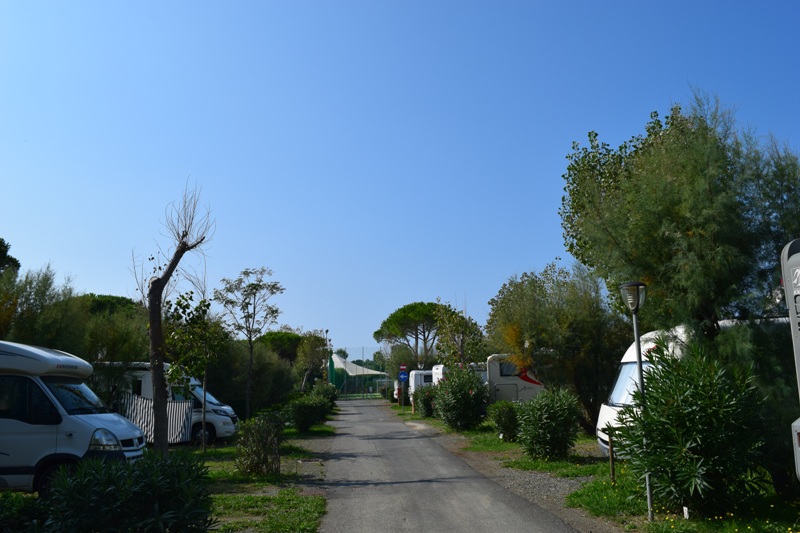 Als ik de nodige telefoontjes gepleegd heb en het in de camper inmiddels al weer behoorlijk warm geworden is, besluit ik te vertrekken. Bij de receptie blijken ook de eigenaren van de Camping Village Mareblu aanwezig, maar het contract ligt al getekend klaar. Super ! Voor vandaag heb ik een enorme rit van maar liefst 5km. op het programma staan. En ook nog de “verkeerde” kant op. Eindbestemming is namelijk New Camping Le Tamerici aan de andere kant van Cecina. Daar kon ik zaterdag niet terecht en de campingdirectrice komt pas later op de middag.