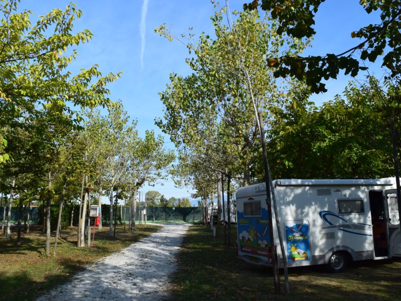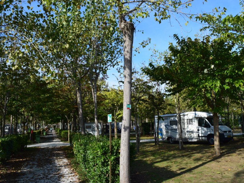 Ik meld me bij de receptie en even later zit ik met de eigenaresse in gesprek. We nemen de papieren en de mogelijkheden door. Het gesprek is goed, maar voor het definitieve besluit moet ik even geduld hebben. Als ik weer richting de hoofdweg rijd, zie ik politie staan. De hoofdweg bestaat hier uit 2 x 2 rijbanen met daartussen een doorgetrokken streep. De volgende camping (Camping Europa) ligt naast Camping Italia en als ik daar ook via de achterzijde naar binnen ga, hoef ik niet helemaal om te rijden.