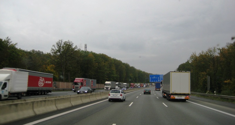 Maar naarmate ik dichter bij Frankfurt kom, wordt het drukker en staat het aan de andere kant over een heel lang stuk stil: