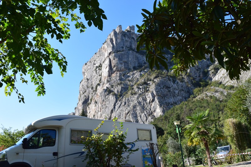Zoals gezegd is er op de camping flink wat werk verricht. Er zijn flink wat bomen gerooid en de camping is meer “open” geworden. Op dit moment zijn ze nog bezig met het verhogen van de plaatsen. Daarom wordt de komende week (de camping is nog open tot 15 november) dit gedeelte van de camping (waar ik sta) afgesloten. Kenmerkend voor Arco zijn de enorme steile “puisten” rechts op de foto hierboven. En mede daarom verblijven veel bergbeklimmers en wandelaars op de campings bij Arco. Nog even een foto (genomen net boven de grond …) van mn campertje in verhouding tot “het steentje” naast de camping: