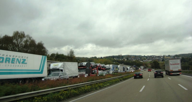 En even later moet ik er zelf ook aan geloven …. over 4 rijbanen staat het ineens volledig stil. Dan denk je “er zal wel wat gebeurd zijn … of wegwerkzaamheden”, maar nee hoor … even later rijdt iedereen weer vrolijk verder. Ik maak even een korte stop en bereik na een tijdje Leverkusen. Op de radio hoorde ik al dat er daar files stonden, maar ik heb weer geluk … het staat aan de andere kant stil: