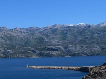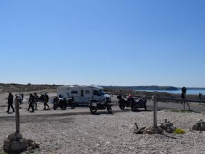 Op de foto hier linksboven zie je in de verte het vasteland van Kroatie waar afgelopen nacht sneeuw gevallen is. Ook niet zo gek als je je bedenkt dat wij vanochtend ook even de kachel aan moesten. Als ik terug kom bij de camper zijn we inmiddels ingesloten door een groep Italiaanse motorrijders. Gelukkig komen we heelhuids weg en even verder draaien we een kruip-door-sluip-door-weggetje op richting het plaatsje Povljana.