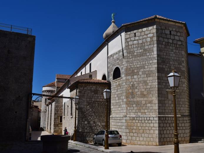 Op 1 van de terrasjes op de foto hier rechtsboven gaan we later even (warm) lunchen. Ook het stadje Krk kent vele (gezellige) steegjes met leuke winkeltjes, maar eerst lopen we deze enorme Maria Kathedraal tegen het lijf. Deze ligt naast het oude kasteel waarvan je links op de foto hieronder nog net een stukkie ziet