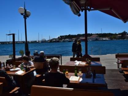 Njivice blijkt een leuk plekkie met gezellige terrasjes. Als we een wandeling gemaakt hebben willen we eigenlijk weer terug richting camper, maar tja … die terrasjes zijn zo aanlokkelijk: