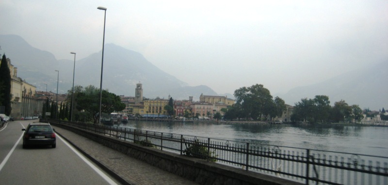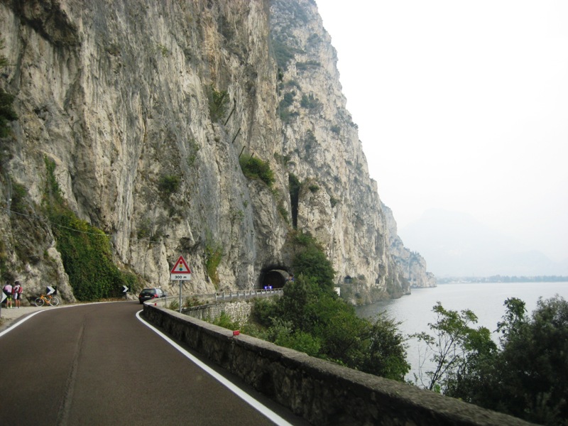 Over de 50 km van Salo naar Riva del Garda doe ik meer dan een uur. Bij 1 van de tunnels staan verkeerslichten en daar moeten we ongeveer 10 minuten wachten voor het verkeer van de andere kant. In de tunnel begrijp ik dat volkomen, want het is errug smal. Dan ineens komt er toch een auto van de andere kant. De Audi voor mij vliegt van schrik bijna tegen de tunnelwand en we kunnen elkaar net passeren.