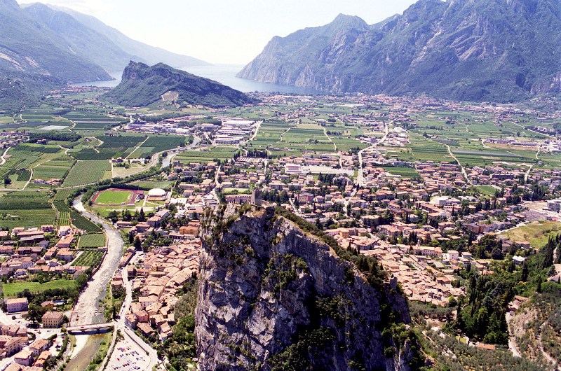 Zoo Camping ligt linksonder op de foto aan de rivier Sarca. In de verte zie je Riva del Garda liggen, op ongeveer 9km. van de camping. Riva del Garda is de meest noordelijke plaats aan het Gardameer. Leuk stadje!!