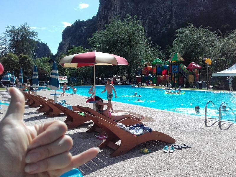 Omdat het in het centrum van Riva del Garda ook niet al te ruim is en het er bovendien behoorlijk druk is, pak ik de nieuwe tunnel richting Arco en rijd even later Camping Arco op. Mn contactpersoon is er niet (wist ik ..) en dus laat ik de papieren achter en rijd ik door naar Zoo Camping. De eigenaren (broer en zus) ken ik al een flink aantal jaren en ik word gastvrij ontvangen.