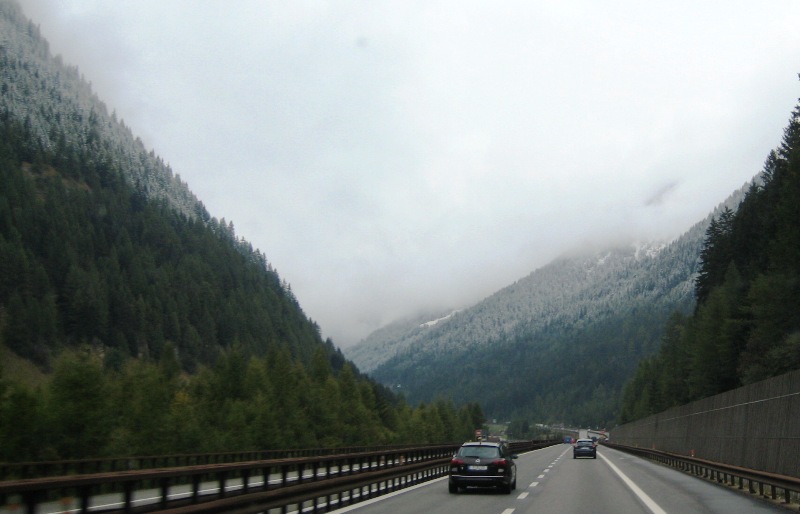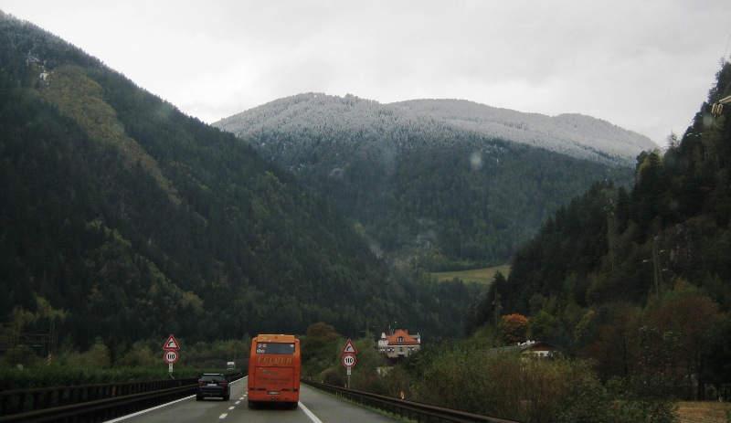 Volgens de voorspellingen op www.ilmeteo.it zou het op een hoogte van 1.050 meter gaan sneeuwen en de weg over de Brenner bereikt een hoogte van 1.355 meter. De temperatuur is inmiddels gedaald tot 3 graden, maar in de camper is het gelukkig nog lekker warm. Ik rijd zonder problemen over de Brenner en passeer even later Innsbruck.